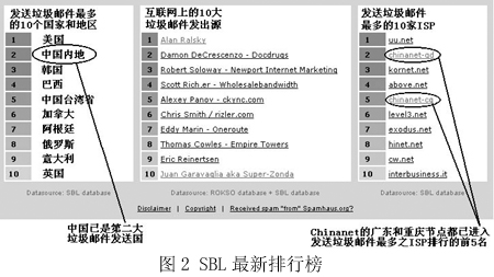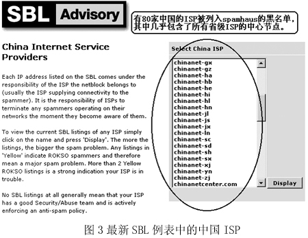 圖2是國(guó)際上著名的反垃圾郵件組織Spamhaus在網(wǎng)站上列出的統(tǒng)計(jì)排行榜,“China”已經(jīng)穩(wěn)居第二大垃圾郵件發(fā)送國(guó)的位置,而右邊的一個(gè)排行榜則從另一個(gè)角度向我國(guó)敲響了警鐘——在專(zhuān)為發(fā)送垃圾郵件的ISP所列的黑名單SBL中,我國(guó)Chinanet的兩個(gè)省級(jí)ISP在前10名中分列第2和第5名。而Chinanet作為中國(guó)的公用信息互聯(lián)網(wǎng)絡(luò),是我國(guó)的Internet骨干網(wǎng),是國(guó)內(nèi)用戶(hù)接入互聯(lián)網(wǎng)的主要途徑之一!拔覀冋娌幌M赃@樣的方式‘揚(yáng)名海外’”,來(lái)自一家ISP的一位不肯透露姓名的女士說(shuō),“其實(shí)我們也是受害者!”