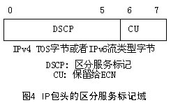 DS標記域定義為IPv4頭部的TOS(Type of Service)字節(jié)或IPv6頭部的流類型(Traffic Class)字節(jié)。如圖4所示。其中DSCP(6bit)即為區(qū)分服務標記,CU(2bit)在本體系中沒有使用,IETF已將它定義為ECN(Explicit
