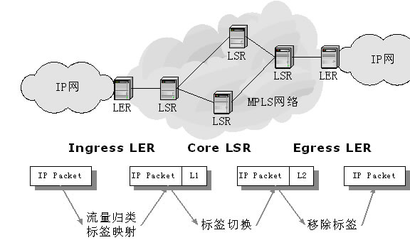 標簽邊緣路由器(Lable Edge Router,LER):LER是MPLS網(wǎng)絡同其他網(wǎng)絡相連的邊緣設備,它提供流量分類和標簽的映射(作為Ingress)、標簽的移除功能。