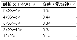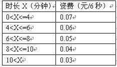例3,國內(nèi)長途話費在時長不超過4分鐘的情況下,按0.07元/6秒收。怀^4分鐘但不超過6分鐘,統(tǒng)一按0.06元/6秒收。怀^6分鐘但不超過8分鐘,統(tǒng)一按0.05元/6秒收取;超過8分鐘但不超過10分鐘,統(tǒng)一按0.04元/6秒收。怀^10分鐘,統(tǒng)一按0.03元/6秒收取。