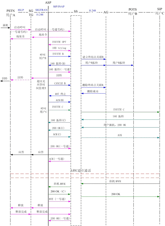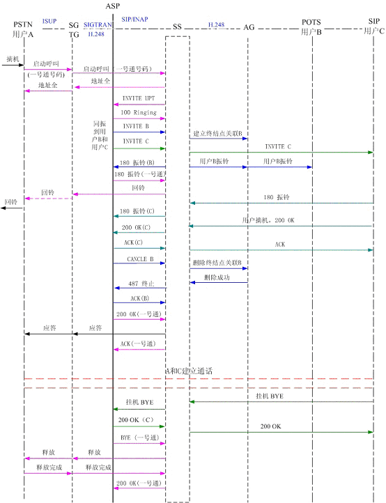 圖5為PSTN用戶A撥打一號(hào)通用戶,順呼軟交換域AG下POTS用戶B和SIP用戶C,其中軟交換和應(yīng)用服務(wù)器以SIP協(xié)議相連,軟交換和AG、軟交換和TG以H.248協(xié)議相連?梢钥吹剑脩鬊首先振鈴,振鈴達(dá)到規(guī)定時(shí)間后,應(yīng)用服務(wù)器取消了對(duì)用戶B的振鈴,轉(zhuǎn)而對(duì)用戶C振鈴。用戶C摘機(jī)應(yīng)答,通話結(jié)束,用戶C掛機(jī),系統(tǒng)釋放了呼叫。