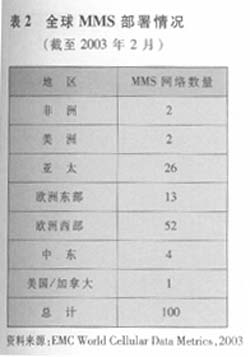 據(jù)EMC統(tǒng)計,到2003年2月,全球在47國家有100家運營商部署了MMS網(wǎng)絡(見表2)。