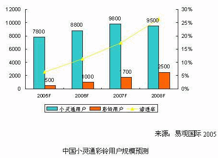 亞太領先的高科技智囊機構-易觀國際最新推出的《固網(wǎng)增值業(yè)務研究系列報告-彩鈴彩話2005》中,易觀預測,2005年國內小靈通彩鈴用戶總數(shù)將達到500萬戶,市場規(guī)模為1.7億元人民幣;到2008年,小靈通彩鈴用戶有望達到2,500萬戶,市場規(guī)模將超過21億元人民幣。