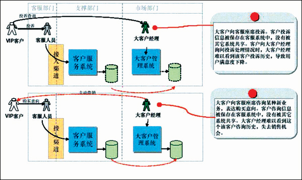 投訴的后臺處理流程分布在BOSS系統(tǒng)、1860客服中心、DSMP數(shù)據(jù)業(yè)務(wù)管理平臺以及OA多個業(yè)務(wù)支撐系統(tǒng)之中,系統(tǒng)之間相對獨(dú)立,同時投訴的交互數(shù)據(jù)分散在各個系統(tǒng)內(nèi),沒有一個完整、統(tǒng)一的客戶投訴資料,從而無法在不同的服務(wù)渠道中取得完整的客戶投訴信息,影響了客戶服務(wù)的質(zhì)量。當(dāng)公司管理層需要了解某一項(xiàng)活動的開展情況或近期的投訴熱點(diǎn)、焦點(diǎn)問題時,操作人員只能采用傳真方式,臨時要求全省17地市、公司在一定時間內(nèi)上報,匯總后研究分析再行提交,使投訴熱點(diǎn)或焦點(diǎn)問題不能及時反饋給管理層。信息嚴(yán)重滯后,更談不上針對客戶投訴咨詢熱點(diǎn)問題進(jìn)行數(shù)據(jù)挖掘,推出針對性的營銷策略。
