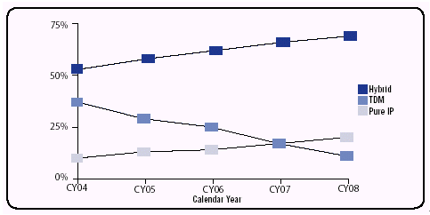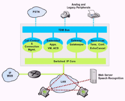 IP Enabled類IP-PBX的核心交換還是基于64K的傳統(tǒng)TDM交換網(wǎng)絡,由一條傳統(tǒng)TDM BUS進行控制,IP業(yè)務的支持需外接網(wǎng)關(guān)(可為內(nèi)置插板或外置模塊),其優(yōu)點與傳統(tǒng)TDM