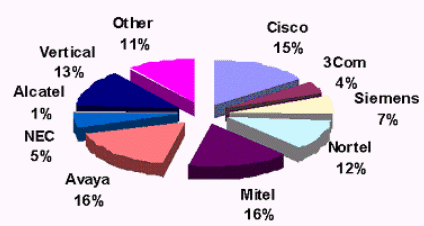 Avaya,思科和北電在上一個季度的增長率,鞏固了在中小型商業(yè)用戶市場的占有率排名第一的地位,并超過了在此領(lǐng)域的4個主要競爭對手(3Com,Shoretel,