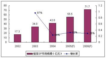 繼2004年中國政府和運(yùn)營商監(jiān)管力度的加大,2005年的短信SP市場規(guī)模增長率為32%,SP市場規(guī)模55.5億元,比2004年略有上升。基于目前短信市場增量市場的縮小,其增長主要依靠對(duì)存量市場需求的深度挖掘。諾盛預(yù)計(jì)2006年的短信市場繼續(xù)保持平穩(wěn)的增長勢頭,增長率將達(dá)29%。