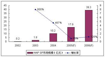 2005年中國運(yùn)營商對(duì)WAP沉默用戶的清理和一系列內(nèi)容監(jiān)管措施使得WAP市場前兩年的高速增長勢頭減緩,SP市場規(guī)模增長率下探至75%,規(guī)模達(dá)17.9億元。諾盛預(yù)計(jì)由于運(yùn)營商監(jiān)管政策的連續(xù)性及其對(duì)免費(fèi)WAP網(wǎng)站的政策調(diào)整,2006年的WAP市場仍然無法恢復(fù)2004年以前的高速增長勢頭,但增長率略有回暖,達(dá)到120%。