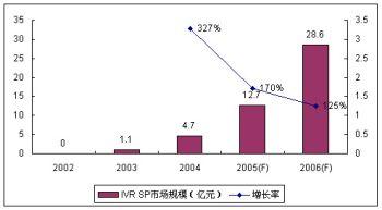 由于運(yùn)營商的監(jiān)管和增量市場需求的減少,2005年IVR高速增長的勢頭有所回落,市場增長速度趨于理性,SP市場份額增長率為170%,整體SP市場份額達(dá)到12.7億元。諾盛預(yù)計(jì)2006年IVR市場增長率將繼續(xù)回調(diào),但絕對(duì)增長率仍然較快,達(dá)到125%。