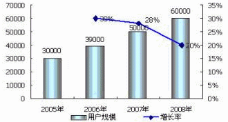 2006年1月?lián)Z盛發(fā)布的最新《2005-2006年移動(dòng)增值業(yè)務(wù)市場(chǎng)回顧與展望》報(bào)告數(shù)據(jù)顯示,2005年中國(guó)的移動(dòng)增值業(yè)務(wù)用戶規(guī)模總數(shù)達(dá)到了3億,市場(chǎng)規(guī)模達(dá)到近近4588億元。諾盛預(yù)計(jì),2006年移動(dòng)增值業(yè)務(wù)用戶規(guī)模將達(dá)到3.9億,市場(chǎng)規(guī)模為620億元;2007年在3G的刺激下,移動(dòng)增值業(yè)務(wù)用戶規(guī)模將達(dá)到5億,市場(chǎng)規(guī)模為810億元;2008年用戶規(guī)模將達(dá)到6億,市場(chǎng)規(guī)模為1053億。移動(dòng)增值業(yè)務(wù)用戶規(guī)模年增長(zhǎng)率在20%以上,市場(chǎng)規(guī)模增長(zhǎng)率在30%以上。