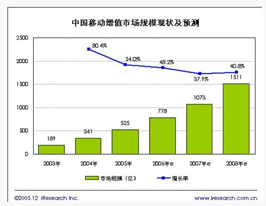 隨著中國移動(dòng)電話用戶的不斷增長和移動(dòng)增值服務(wù)的不斷發(fā)展創(chuàng)新,移動(dòng)增值服務(wù)已經(jīng)成為現(xiàn)隨著市場的發(fā)展和不斷規(guī)范,中國移動(dòng)增值服務(wù)市場將進(jìn)入相對(duì)平穩(wěn)的發(fā)展階段。據(jù)iResearch預(yù)測(cè),中國移動(dòng)增值服務(wù)的市場規(guī)模增長速度將逐年減緩,到2008年受奧運(yùn)會(huì)影響增長速度提高,規(guī)模將突破1500億元。