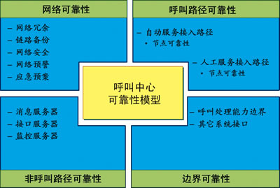 根據(jù)多年的實踐經(jīng)驗,對電信級呼叫中心提出如下高可靠性分析模型,如圖1所示。該模型將電信級呼叫中心可靠性分析分為四個維度:網(wǎng)絡(luò)可靠性、呼叫路徑可靠性、邊界可靠性、非呼叫路徑可靠性。