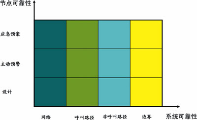 呼叫中心可靠性模型的每個維度都有一些設(shè)備/軟件節(jié)點(diǎn)組成,每個維度的可靠性需要通過組成節(jié)點(diǎn)以及節(jié)點(diǎn)之間鏈路的可靠性來實現(xiàn),節(jié)點(diǎn)可靠性的實現(xiàn)可以抽象為3個層次:設(shè)計可靠性、主動預(yù)警能力和應(yīng)急預(yù)案。通過對所有節(jié)點(diǎn)3個層次的可靠性分析,可以實現(xiàn)可靠性模型每個維度的可靠性,從而實現(xiàn)系統(tǒng)可靠性。根據(jù)圖2的可靠性分析矩陣,可以建立呼叫中心可靠性分析方法。