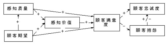 該模型是由六個(gè)隱變量組成的因果模型,其中顧客滿(mǎn)意度是最終要求的目標(biāo)變量,感知質(zhì)量、感知價(jià)值和顧客期望是因變量,而顧客忠誠(chéng)度和顧客抱怨則是顧客滿(mǎn)意與否的結(jié)果變量。