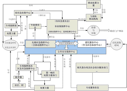 指政府決策指揮中心、先期指揮中心、便民服務中心、公共安全監(jiān)控中心,通常還有移動指揮中心和災備中心,以及其它節(jié)點的建設。一般地,先期指揮中心與便民服務中心可互為備份。政府決策指揮中心對重大、特別重大突發(fā)公共事件進行協(xié)調(diào)、決策,偏重于自然災害與生產(chǎn)安全方面,而一般、較重突發(fā)公共事件仍保持由各專業(yè)指揮部指揮、處置,只有當跨區(qū)、跨機構需要協(xié)調(diào)時由政府決策指揮中心進行協(xié)調(diào)。