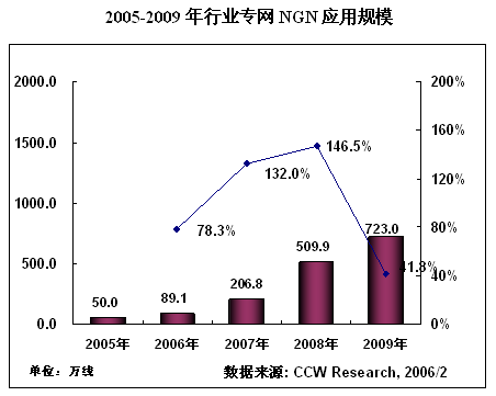 在運營商NGN建設(shè)高速增長的同時,政府、能源、交通等行業(yè)專網(wǎng)NGN建設(shè)也逐漸步入快車道。NGN在行業(yè)專網(wǎng)的應(yīng)用,到2005年底的應(yīng)用規(guī)模達到50萬線,根據(jù)計世資訊(CCW Research)《2005-2006中國NGN產(chǎn)業(yè)應(yīng)用趨勢研究報告》的預(yù)測,未來4年,NGN在行業(yè)專網(wǎng)市場將以95%的復(fù)合增長率高速增長。