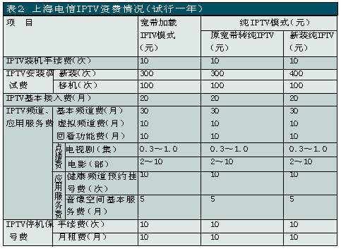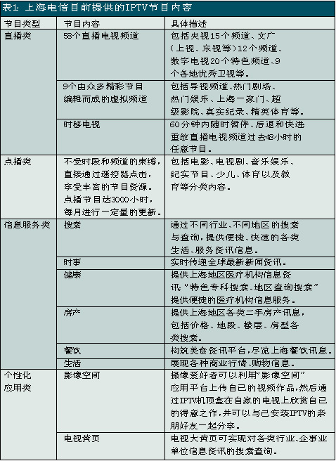 上海電信是國內(nèi)關(guān)注并切入IPTV業(yè)務(wù)較早的電信運(yùn)營(yíng)商之一,自2005年就開始積極測(cè)試和試驗(yàn)。此次上海電信在全上海市范圍內(nèi)推出IPTV業(yè)務(wù),被業(yè)界看作是“中國IPTV規(guī)模商用的新紀(jì)元”。除了影視節(jié)目收看、視頻內(nèi)容點(diǎn)播、時(shí)移功能外,上海電信的IPTV服務(wù)還包括時(shí)事新聞、遠(yuǎn)程醫(yī)療、視頻房產(chǎn)信息、餐飲信息、天氣預(yù)報(bào)、票務(wù)查詢等信息服務(wù)以及可視電話、IPTV游戲等個(gè)性化應(yīng)用。其中IPTV的直播頻道有58個(gè),視頻點(diǎn)播可選節(jié)目量達(dá)3000小時(shí)以上。另外,上海電信還推出了影像空間和電視大黃頁等應(yīng)用服務(wù),攝像愛好者可以利用“影像空間”應(yīng)用平臺(tái)上傳自己的視頻作品,然后通過IPTV機(jī)頂盒在自家的電視上欣賞自己的得意之作,并可以與已安裝IPTV的親朋好友一起分享;電視大黃頁可實(shí)現(xiàn)對(duì)各類行業(yè)、企事業(yè)單位信息資訊的搜索查詢。
