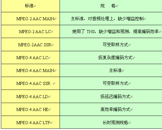 目前國(guó)際上對(duì)音頻處理技術(shù)上標(biāo)準(zhǔn)較多,在對(duì)下一代實(shí)時(shí)交互音頻處理上可以采用MPEG-1Layer2或AAC系列音頻,對(duì)選用標(biāo)準(zhǔn)的原則是,音頻頻響范圍要達(dá)到22KHz,這樣就幾乎可以覆蓋了人耳聽覺的全部范圍,甚至在高頻方面還有所超越,能夠使現(xiàn)場(chǎng)音頻得到真實(shí)自然的還原,并且在還原時(shí)可以采用雙聲道立體聲回放,使整個(gè)視頻通訊的聲音有更強(qiáng)的臨近感,達(dá)到CD級(jí)音質(zhì)。同時(shí)在對(duì)鏈路帶寬的適應(yīng)和編解碼效率上達(dá)到最佳。下表列出AAC的9種規(guī)格。