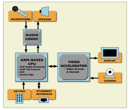 如果通過(guò)代碼匯編和手動(dòng)軟件優(yōu)化,VoIP編解碼器(G.711、G.729AB、G.723.1、iLBC)、音頻處理(DTMF以及通話(huà)進(jìn)行音調(diào)檢測(cè)/產(chǎn)生)語(yǔ)音質(zhì)量增強(qiáng)(線(xiàn)路和聲學(xué)回聲消除和抖動(dòng)緩沖等)以及其他相似的功能現(xiàn)在都能有效地在應(yīng)用處理器上實(shí)現(xiàn)。越來(lái)越多的應(yīng)用處理器集成了硬件加速功能,我們可以利用硬件加速來(lái)處理視頻編碼和解碼(見(jiàn)圖2)。