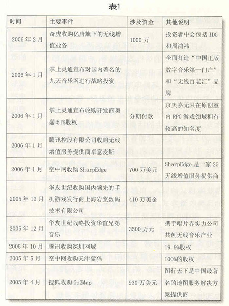 從2003年開始,國內(nèi)就顯現(xiàn)出并購增值服務(wù)運(yùn)營企業(yè)的苗頭。2004年以來,隨著整治增值服務(wù)運(yùn)營企業(yè)的力度不斷加大,并購漸成風(fēng)潮(見表1)。2004年2月,新浪收購深圳網(wǎng)興科技公司;2004年5月,搜狐收購手機(jī)WAP服務(wù)提供商北京吉菲爾公司。2005年,在“超級女生”節(jié)目大獲成功后,掌上靈通宣布將對國內(nèi)著名的九天音樂網(wǎng)進(jìn)行戰(zhàn)略投資,全面打造“中國正版數(shù)字音樂第一門戶”和“無線百老匯”品牌。各大移動(dòng)增值業(yè)務(wù)服務(wù)商通過并購競爭對手,門戶網(wǎng)站可以在移動(dòng)增值服務(wù)領(lǐng)域?qū)で笮碌耐黄,獲得可觀的利益,增強(qiáng)自身的競爭力。伴隨著3G商用的日益臨近和市場競爭的不斷加劇,主流SP(服務(wù)提供商)進(jìn)一步加快了資本購并和業(yè)務(wù)整合的步伐,整個(gè)SP行業(yè)將加速洗牌。經(jīng)過市場整合,主流SP將不斷做大做強(qiáng),而相當(dāng)多的缺乏市場競爭力的SP將被淘汰出局。