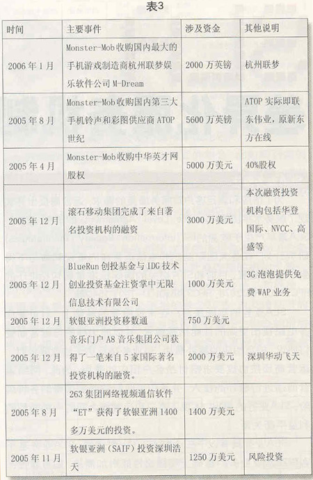 近幾年來,一些資本投資商將投資的重點(diǎn)放到了無線音樂、手機(jī)游戲和手機(jī)視訊等業(yè)務(wù)領(lǐng)域,逐步加大了對SP的投資力度(見表3)。進(jìn)入2005年以來,著眼于2.5G向3G的全面演進(jìn),風(fēng)險(xiǎn)投資對SP的投資力度進(jìn)一步加大。以滾石移動(dòng)為例,在2002年和2004年獲得兩輪風(fēng)險(xiǎn)投資之后,滾石移動(dòng)憑借在無線音樂領(lǐng)域取得的良好市場業(yè)績,又獲得了智基創(chuàng)投、華登國際、聯(lián)想投資等公司的投資,投資金額達(dá)3000萬美元。繼2004年10月獲得IDG投資以后,2005年12月7日,國內(nèi)著名的數(shù)字音樂門戶——A8音樂集團(tuán)獲得了包括IDG和Intel投資公司在內(nèi)的5家國際著名投資機(jī)構(gòu)的投資,投資金額達(dá)2000萬美元。同月,掌中無限則獲得了來自全球性風(fēng)險(xiǎn)投資商BlueRun創(chuàng)投基金和IDG總額達(dá)上千萬美元的投資。