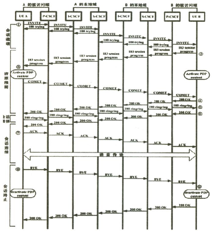 B接受了這個(gè)會(huì)話請求,但此時(shí)他不回鈴?fù)ㄖ狝,他返回183sessionprocess應(yīng)答表示他接受該會(huì)話,同時(shí)要求A對(duì)此表示確定,這個(gè)應(yīng)答通過各個(gè)CSCF傳給A。同時(shí)B激活一個(gè)GPRSPDP上下文,它被用來通過IMS的IP接入點(diǎn)來建立語音通道。