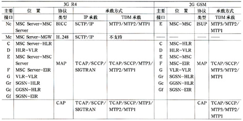 以下首先對3G R4核心網(wǎng)與2G GSM核心網(wǎng)中的主要接口與協(xié)議進行列舉、比較,如表1所示。