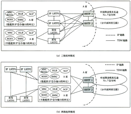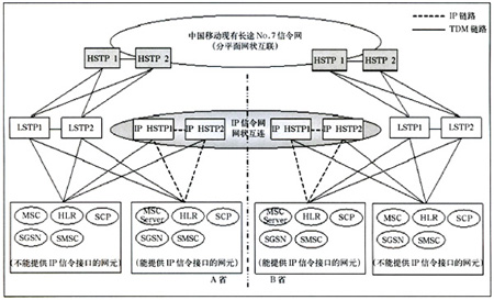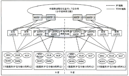 該種方案情況下,省內支持IP信令的網(wǎng)元直接與IP LSTP相連(兩級組網(wǎng)情況下還需要通過TDM方式與現(xiàn)有HSTP相連),不支持IP信令的網(wǎng)元仍保持原有連接方式與現(xiàn)有LSTP相連(兩級組網(wǎng)情況下還要與HSTP)。省際信令消息仍由現(xiàn)有長途No.7信令網(wǎng)疏通,省內信令由LSTP疏通。