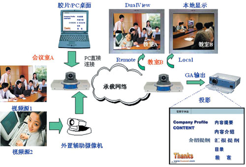 會(huì)議中常常需要同時(shí)傳送演講人的演講膠片和演講人的圖像,這套視訊系統(tǒng)非常方便地支持此功能,只需要把演講人的便攜機(jī)用線(xiàn)纜接到會(huì)場(chǎng)的終端上,通過(guò)終端的SXGA輸入功能可方便地將膠片信息發(fā)送到遠(yuǎn)端會(huì)場(chǎng),遠(yuǎn)端會(huì)場(chǎng)通過(guò)終端的SXGA輸出接口將膠片內(nèi)容通過(guò)投影設(shè)備顯示出來(lái),而終端的主視頻輸出接口顯示的是遠(yuǎn)端演講人的圖像。