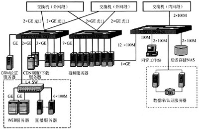 核心包括以下子系統(tǒng):WEB服務子系統(tǒng)、認證服務器、CDN調度/下載服務器、流媒體播出服務子系統(tǒng)、DRM認證服務子系統(tǒng)、數(shù)據(jù)庫服務子系統(tǒng)、后備存儲NAS系統(tǒng)、內部管理服務子系統(tǒng)等。