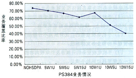 由圖1可知,當HSDPA分配功率為5W時,HSDPA對網(wǎng)絡(luò)覆蓋沒有很大影響;當它為10W時,如果HSDPA用戶數(shù)不大,影響也有限;但是,當它為10W時,如果HSDPA用戶數(shù)持續(xù)增加,則會產(chǎn)生嚴重影響。在下行從NOHSDPA的74%降低到10W15U的40.62%時,PS384業(yè)務(wù)降低了近一半。同時,隨著業(yè)務(wù)速率的提高,網(wǎng)絡(luò)影響越大。另外,在一定的HSDPA功率分配前提下,隨著HSDPA用戶數(shù)的增加,過載率增大,網(wǎng)絡(luò)中高速數(shù)據(jù)業(yè)務(wù)的比例隨之減少,各點上的用戶速率不斷降低;同時,用戶的增多使得各小區(qū)的HSDPA發(fā)射功率不斷增大,導(dǎo)致區(qū)域中間各點的終端接收功率普遍增加。