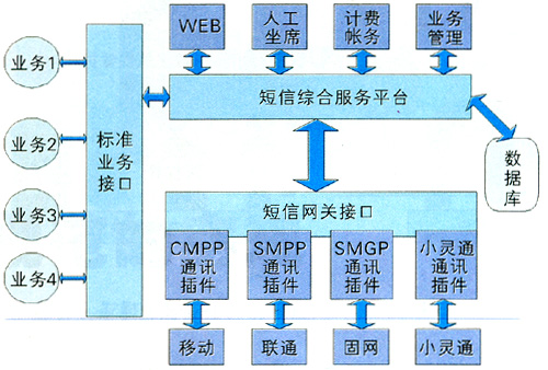 業(yè)務(wù)管理平臺是為運營商提供的可快速啟動各種數(shù)據(jù)業(yè)務(wù)的平臺,具有強大的資源調(diào)度能力。它連接運營商的基礎(chǔ)網(wǎng)絡(luò)和業(yè)務(wù)支撐系統(tǒng)(客服系統(tǒng)、計費系統(tǒng)),為服務(wù)提供商/內(nèi)容提供商們提供各種移動資源(如短信息中心資源、用戶信息資源、語音資源等)、功能資源(如單點認證、計費、漫游控制等)及各種公共的資源引擎(如地理位置、語音交互、推送信息等)。業(yè)務(wù)支撐系統(tǒng)是運營商為了開展業(yè)務(wù)必須建設(shè)的客服系統(tǒng)、營業(yè)系統(tǒng)、計費系統(tǒng)等子系統(tǒng)。圖3是目前常用的綜合短信平臺[3]。