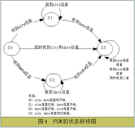在總結(jié)了前人工作經(jīng)驗和結(jié)合本系統(tǒng)的實際問題的基礎(chǔ)上,我們在對話管理的具體實現(xiàn)上,將框架理論和有限狀態(tài)自動機理論相結(jié)合,完成了一個智能的對話管理模塊。我們先將對話管理限制在天氣查詢領(lǐng)域。在系統(tǒng)中,通過人機之間的對話和確認(rèn),系統(tǒng)需要得到要查詢的時間和地點信息之后反饋查詢結(jié)果。