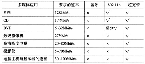 2.0接口相當,遠遠高于無線局域網(wǎng)802.11b的11 Mbit/s,也比下一代無線局域網(wǎng)802.11a/g的54 Mbit/s高出近一個數(shù)量級。UWB通信的功耗較低,能更好地滿足使用電池的移動設備的要求。另外,UWB信號的功率譜密度非常低,信號難以被檢測到,再加上采用的跳頻、直接序列擴頻等擴頻多址技術,使非授權者很難截獲傳輸?shù)男畔,因而安全性非常好。?是一些典型的實時多媒體應用對不同無線傳輸技術的數(shù)據(jù)傳輸速率的要求。從表中可以看出,如果采用無線的方式來進行傳輸,只有UWB技術可以滿足各種應用的要求。