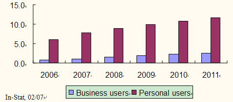 In-Stat預(yù)計(jì),到2011年中國(guó)手機(jī)電子郵件用戶達(dá)到1400萬(wàn)戶,其中企業(yè)用戶達(dá)到250萬(wàn),個(gè)人用戶達(dá)到1170萬(wàn)。2007到2011年,企業(yè)用戶年均復(fù)合增長(zhǎng)率為24.8%,個(gè)人用戶年均復(fù)合增長(zhǎng)率為10.6%。如下圖所示: