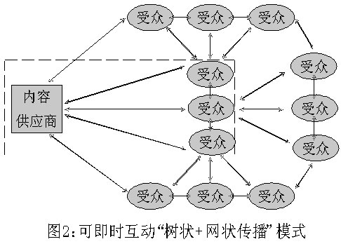 我們認(rèn)為,手機(jī)短信新聞的傳播方式,是“樹狀+網(wǎng)狀傳播”,即由新聞內(nèi)容提供方完成點(diǎn)到面的“樹狀傳播”后,信息接受終端又可以完成一個(gè)“網(wǎng)狀傳播”。因此,手機(jī)短信新聞,不僅傳播鏈較長,而且可以相互交錯(cuò)形成網(wǎng)狀互動(dòng),“傳者”和“受者”可以隨時(shí)出現(xiàn)“角色互換”。(見圖2)