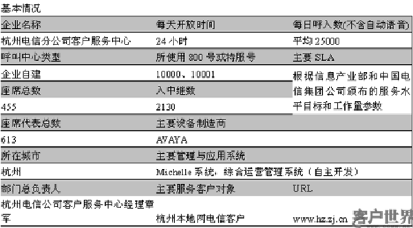 浙江省電信有限公司杭州市分公司客戶服務(wù)中心(以下簡稱杭州電信客服中心,或者杭州電信10000號)成立于2002年9月,是一個(gè)基于CTI技術(shù)、充分利用通信網(wǎng)和計(jì)算機(jī)網(wǎng)絡(luò)的綜合信息服務(wù)系統(tǒng),以電話為主,輔之以傳真、短信、Email、互聯(lián)網(wǎng)等多種接觸媒體,通過人工、自助語音與網(wǎng)上服務(wù)的方式,為杭州400萬電信客戶提供綜合電信業(yè)務(wù)的咨詢、查詢、受理、投訴、報(bào)障和電話營銷。建有2130路中繼通道,1410路自動(dòng)語音通道,186個(gè)人工服務(wù)座席、189個(gè)電話營銷座席、80個(gè)外包座席,占地5600多平米,分別位于杭州市惠興路9號和慶春路133號。