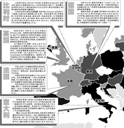 對于歐洲觀眾來說,IPTV(網(wǎng)絡(luò)付費(fèi)電視)就是他們未來的生活主畫面之一。他們只需每月交付30歐元(約合人民幣309元)到60歐元(約合人民幣618元)的費(fèi)用,便可在電視或電腦上選擇收看上百個頻道的電視節(jié)目。歐洲雖然缺乏強(qiáng)大的衛(wèi)星網(wǎng)絡(luò)作為技術(shù)支持,不過卻擁有多家實(shí)力雄厚的電信營運(yùn)商,這些巨頭們擁有相同的興趣和市場,正考慮是否聯(lián)合經(jīng)營,共同分食歐洲網(wǎng)絡(luò)電話電視市場這塊“大蛋糕”。
