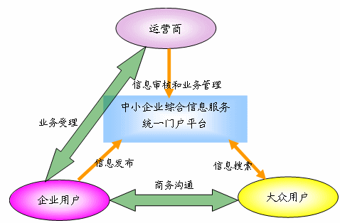 “中小企業(yè)綜合信息服務(wù)統(tǒng)一門戶平臺(tái)”的角色包括:運(yùn)營(yíng)商、企業(yè)用戶、大眾用戶三大角色。各角色與平臺(tái)之間及角色之間的業(yè)務(wù)關(guān)系如下: