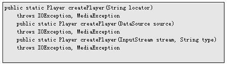 每個MMAPI程序都需要創(chuàng)建一個Player對象,前面我們已經(jīng)介紹過,MMAPI使用Manager的CreatePlayer函數(shù)來創(chuàng)建Player對象,該函數(shù)有三個版本,其格式如下: