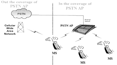 如圖3所示,使用藍(lán)牙CTP MS(mobile station)和PSTN AP,通過(guò)本地交換機(jī)與固網(wǎng)相連。其中,MS為雙模終端,可以根據(jù)不同網(wǎng)絡(luò)的資費(fèi)差異預(yù)先設(shè)置采用何種網(wǎng)絡(luò)接打電話。在藍(lán)牙覆蓋范圍內(nèi),根據(jù)設(shè)置,CTP
