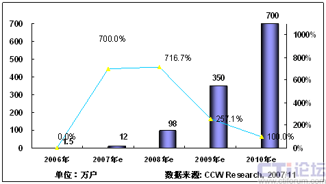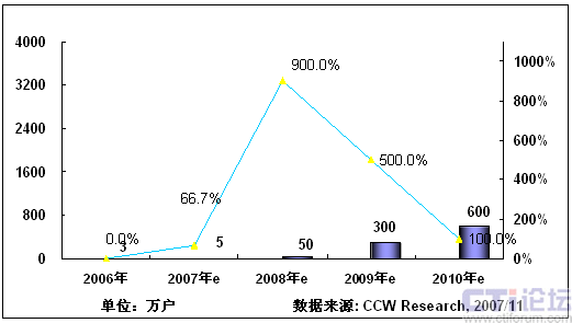 2008年,隨著3G在中國商用,以及奧運(yùn)帶來豐富視頻內(nèi)容,將推動手機(jī)電視作為一項(xiàng)重要的移動增值業(yè)務(wù)將進(jìn)入市場發(fā)展期;同時隨著網(wǎng)絡(luò)、終端、內(nèi)容、商業(yè)模式等因素的發(fā)展,產(chǎn)業(yè)鏈初步完善,看好手機(jī)電視業(yè)務(wù)的產(chǎn)業(yè)鏈各環(huán)節(jié)大力介入,北京奧運(yùn)會將大大激發(fā)用戶使用手機(jī)電視業(yè)務(wù)的熱情,從而推動手機(jī)電視進(jìn)入快速發(fā)展階段。根據(jù)計(jì)世資訊預(yù)計(jì),2008年中國手機(jī)電視用戶將達(dá)到400萬。