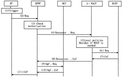 當(dāng)收到來(lái)自SPDF的資源請(qǐng)求后,A-RACF便按照其事先從NASS收到的用戶接入清單進(jìn)行鑒別。如果A-RACF核對(duì)從SPDF收到的QoS請(qǐng)求信息可以提供,即接受該請(qǐng)求,并且A-RACF在RCEF中加載該傳輸策略。RCEF實(shí)施A-RACF傳送過(guò)來(lái)的二層/三層媒體流策略,完成門控、QoS標(biāo)記、帶寬限制等功能。如圖6即為AF請(qǐng)求資源時(shí)的具體消息流[7]。