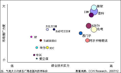 市場(chǎng)競(jìng)爭(zhēng)非常激烈,但還沒有一個(gè)廠商占據(jù)對(duì)優(yōu)勢(shì)。目前統(tǒng)一通信市場(chǎng)形成了兩類供應(yīng)商的競(jìng)爭(zhēng):電信網(wǎng)絡(luò)設(shè)備廠商(如思科、北電)和軟件廠商(如微軟、IBM)。電信設(shè)備廠商的優(yōu)勢(shì)集中在硬件產(chǎn)品上,比如路由器、VoIP網(wǎng)關(guān)產(chǎn)品、軟交換設(shè)備;而軟件廠商,像微軟、IBM的優(yōu)勢(shì)在于其在電腦桌面上的絕對(duì)統(tǒng)治力,幾乎所有的統(tǒng)一通信企業(yè)都需要和微軟、IBM進(jìn)行合作。但從現(xiàn)在的發(fā)展?fàn)顩r來(lái)看,各類廠商之間既有競(jìng)爭(zhēng)又有合作,但還沒有一個(gè)廠商占據(jù)對(duì)優(yōu)勢(shì)。