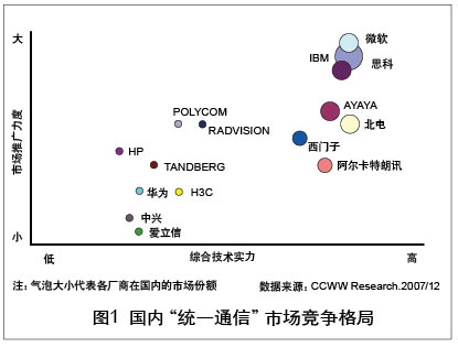 “統(tǒng)一通信”與傳統(tǒng)通信的根本區(qū)別在于不僅僅是網(wǎng)絡(luò)的融合,也是應(yīng)用的融合。從這個(gè)層面來(lái)看,“統(tǒng)一通信”真正帶給用戶的是成本的降低、工作效率的提升以及整個(gè)運(yùn)行機(jī)制的改變!敖y(tǒng)一通信”是以人性化為特征應(yīng)用層面的融合,這種融合囊括了更多的內(nèi)容、覆蓋更廣闊的領(lǐng)域、具有更大的力量,它使得通信產(chǎn)業(yè)與IT產(chǎn)業(yè),通信設(shè)備商、軟件廠商與電信運(yùn)營(yíng)商之間的邊界越來(lái)越模糊,跨行業(yè)、跨領(lǐng)域的聯(lián)盟與合作成為開拓市場(chǎng)的必需。但隨著眾廠商的紛紛加入,多款“統(tǒng)一通信”產(chǎn)品及解決方案的推出,“統(tǒng)一通信”市場(chǎng)展現(xiàn)出了勃勃生機(jī)和巨大的成長(zhǎng)潛力。在這些廠商中,有市場(chǎng)調(diào)研數(shù)據(jù)顯示思科市場(chǎng)份額領(lǐng)先,市場(chǎng)占有率高達(dá)35%。各類廠商之間既有競(jìng)爭(zhēng)又有合作,但還沒有一個(gè)廠商占絕對(duì)優(yōu)勢(shì)。實(shí)際上,“統(tǒng)一通信”市場(chǎng)上的競(jìng)爭(zhēng)者并不僅僅是這幾家巨頭,眾多網(wǎng)絡(luò)工具廠商、商用電話廠商也參與了這一競(jìng)爭(zhēng)平臺(tái)。幾乎所有和ICT有關(guān)的巨頭廠商都集中在了這個(gè)領(lǐng)域,“統(tǒng)一通信”正進(jìn)入群雄爭(zhēng)霸的時(shí)代。國(guó)內(nèi)“統(tǒng)一通信”市場(chǎng)競(jìng)爭(zhēng)格局如圖1所示。