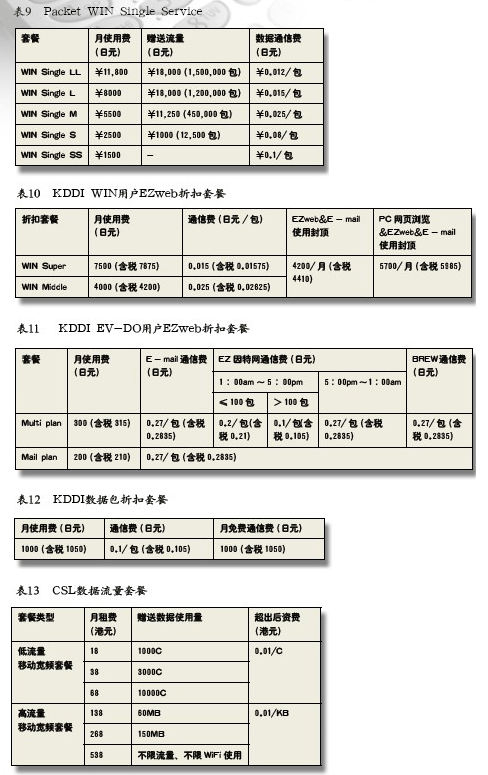 用戶使用WIN au手機,通信包標(biāo)準(zhǔn)計費為0.1日元/包(Packet)(含稅0.105日元),其中1Packe=128Bytes。KDDI為用戶提供分檔包月套餐,見表9。
