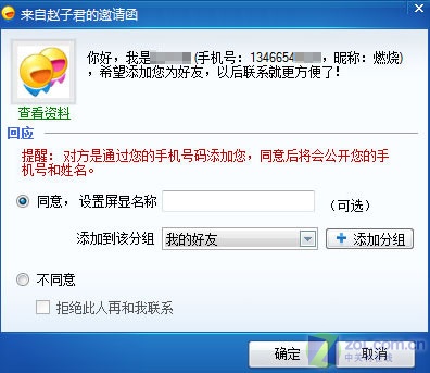 在圖3中,用戶在確認(rèn)好友發(fā)來的信息時(shí),為避免好友過多而忘記對(duì)方的身份,可以直接在上圖中增加類似QQ和MSN的“備注信息”,也即“屏顯名稱”。