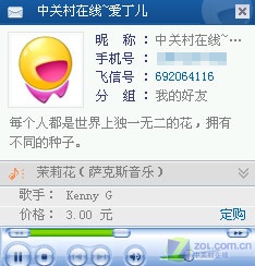 你可以點(diǎn)擊藍(lán)色文字鏈接,在彈出的窗口中單擊左下角的“播放/暫!卑粹o,以實(shí)現(xiàn)在PC機(jī)上聽好友彩鈴(如圖5)!這樣的功能其它IM軟件好像沒有,唯飛信才有的獨(dú)家功能!
