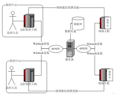 本系統(tǒng)基于瘦客戶端的C/S模式,在體系結(jié)構(gòu)上采用以服務(wù)器為中心的星型結(jié)構(gòu),創(chuàng)新性地把監(jiān)控現(xiàn)場端和監(jiān)控中心端C角色化。即在本系統(tǒng)中所有的監(jiān)控現(xiàn)場端和監(jiān)控中心端相對整個系統(tǒng)的架構(gòu)而言都是客戶端,它們的通信都需要經(jīng)過服務(wù)器的驗證中轉(zhuǎn)。同時,監(jiān)控中心使用者的登錄由于這種架構(gòu)模式,也必須要經(jīng)過服務(wù)器的驗證才能成功登錄,進而獲得監(jiān)控的權(quán)利。