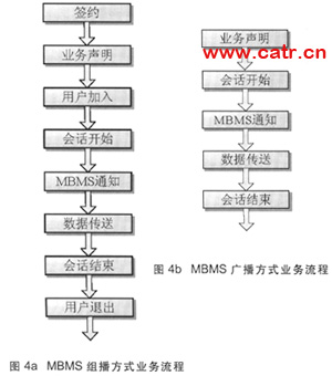 MBMS可應(yīng)用組播模式和廣播模式兩種業(yè)務(wù)模式。廣播模式接近于數(shù)字電視業(yè)務(wù),而組播模式專注和定位于群業(yè)務(wù)。組播模式提供了更好的計(jì)費(fèi)特性,包括服務(wù)訂閱、接入和推出功能,需要用戶簽約相應(yīng)組播組,進(jìn)行業(yè)務(wù)激活,并產(chǎn)生相應(yīng)的計(jì)費(fèi)信息,而廣播業(yè)務(wù)不需要小區(qū)中所有用戶都制定該業(yè)務(wù)便可以獲得。由于組播和廣播模式在業(yè)務(wù)需求上存在不同,導(dǎo)致其業(yè)務(wù)流程也不同(見(jiàn)圖4a、圖4b)。